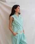 Hand-selected vintage Caché bedazzled jumpsuit in a sky blue pattern.